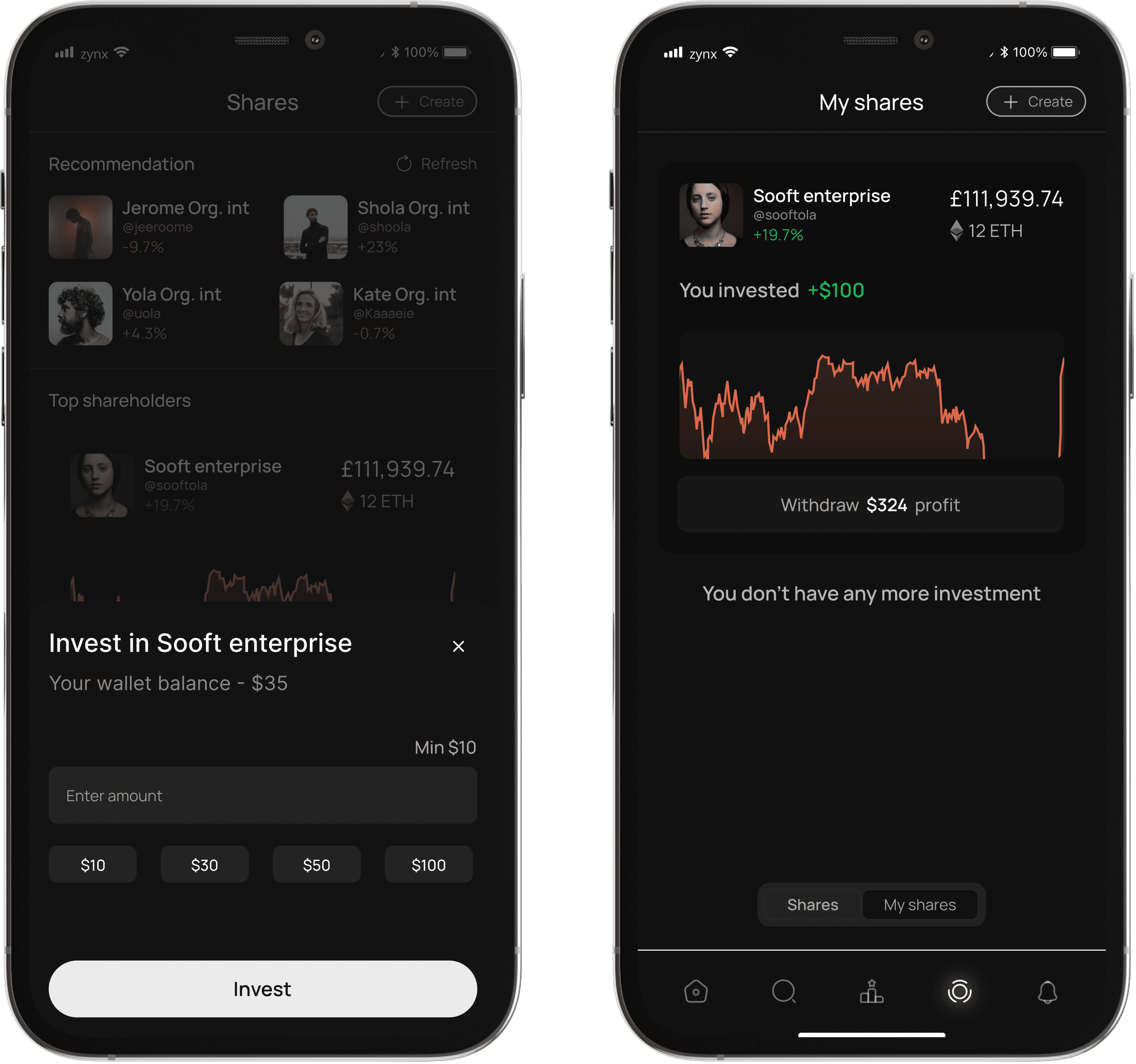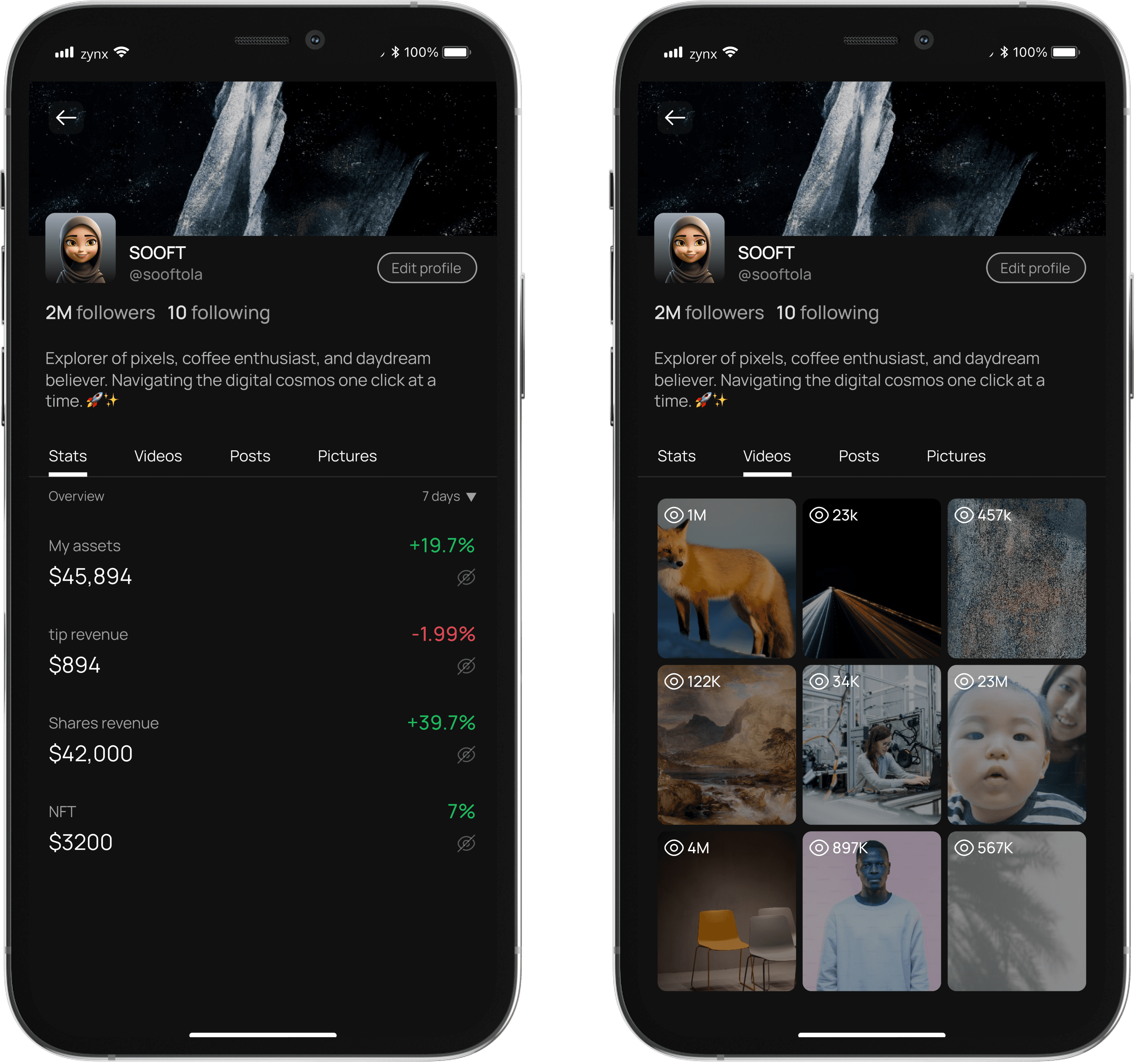 Dive into a transparent breakdown of your financial transactions, earnings from tips, and the performance of your investment shares. Zynx's Profile feature ensures clarity and empowerment in your digital financial ventures.